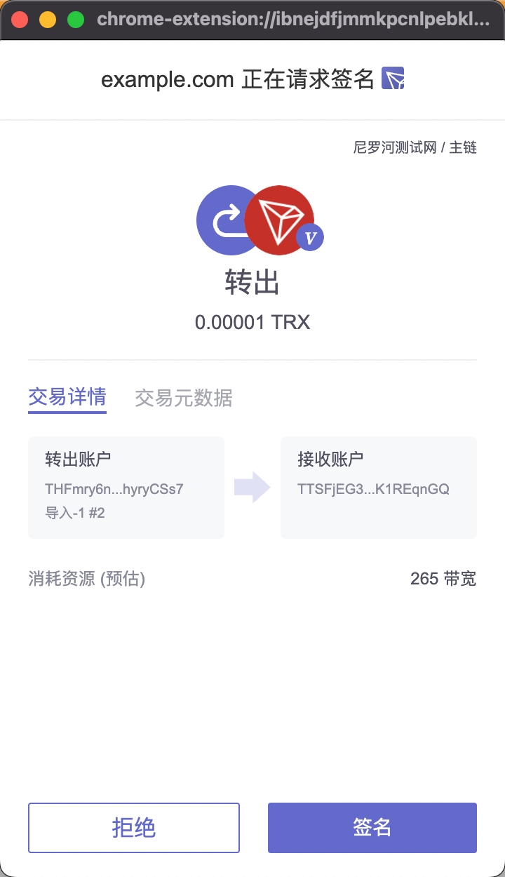 当代码执行到await tronweb.trx.sign(tx);时,TronLink钱包会提示弹窗,需要用户进行确认,如下图: